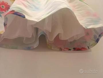 Abito da cerimonia nuovo per ragazza marca Mek (linea Brums), 14-16 anni. Perfettamente rifinito, con scollo in tulle e sottogonna. Veste 160 cm, taglia 40-42. Usato una volta. Difetto: filo tirato sul davanti (foto). Busto ristretto rispetto all’ originale (cuciture interne, foto) ma allargabile se necessario. 20 euro.