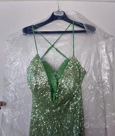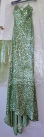 Abito lungo Musani completo di stola, color verde lime, pailettato con profondo scollo sulla schiena. Taglia 42. Indossato una sola volta, unico difetto sulla spallina, riportato in foto allegata in primo piano. Prezzo trattabile
