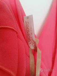 Abito lungo bellissimo in color corallo, scollo a V, dettaglio di rouche sulle maniche, retro con chiusura a zip invisibile una volta indossato.