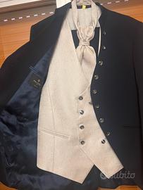 Completo cerimonia composto da pantalone blu,gilet grigio ,cravattone grigio con punto luce ,camicia bianca lucida con colletto a punta +collo di ricambio,giacca blu con bottoni a cascata e chiusura a catenella.