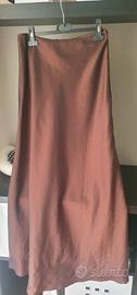 vendo abito lungo da cerimonia color bronzo, taglia 44 , l'abito è formato da gonna lunga vita cm 75, fianchi cm 109, da un corpetto lavorato senza spalline , seno cm 86 , in più ha una stola , molto bello ed elegante