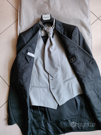 Taglia 50, abito da cerimonia uomo completo grigio scuro PALZILERI : giacca, pantalone gessato, panciotto color argento, cravatta argento con punto luce. Nuovo usato una sola volta, lavato ed igienizzato. Prezzo trattabile. Vero affare!!!