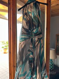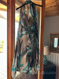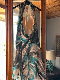 Abito corto da cerimonia colori bianco , nero e toni di azzurro , con scollo all’ americana tg 46.