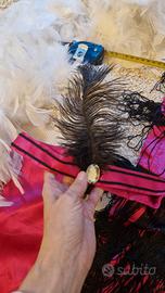 Vestito carnevale o festa charleston, cucito da sarta, color fuxia e nero, con copricapo con piuma, stoffa rimanente dello stesso colore e boa abbinato bianco. Misure 40×60
