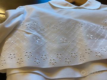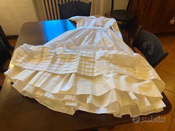 Abito Chemisier Da Cerimonia Cresima Di Sartoria Vintage Anni 60 con pizzo san gallo Pizzo san gallo su corpetto ed ampia gonna a balze, con due sottogonne di cui una inamidata. Completa di acconciatura a cuffia pizzo san gallo e doppio tulle. Taglia per bambina ragazza Altezza alla spalla 110 cm Manica 50 cm Larghezza vita 70 cm