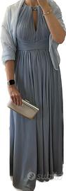 Bel vestito "strutturato" per eventi, cocktail, matrimoni azzurro pastello lungo (ma facilmente accorciabile), scollo all'americana e incrocio sul retro con schiena scoperta. Gonna foderata per evitare trasparenze e coppe interne per sostenere il seno. Stola abbinata in gradazione di colore per coprire spalle e schiena.Utilizzato una sola volta, come nuovo. lavato e sanificato in lavasecco.