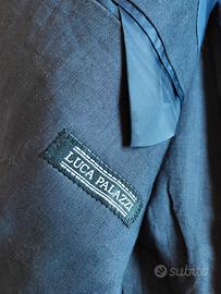 Elegante abito blu in 100% lino. - Tessuto in lino traspirante. - Taglio sartoriale. - Dettagli curati. - Taglia 44 - Pantaloni con orlo da fare