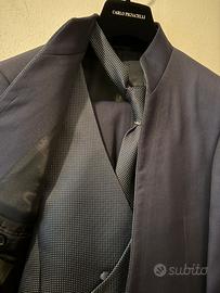 Abito da cerimonia matrimonio uomo tre pezzi completo by Carlo Pignatelli con colletto alla coreana, blu scuro, taglia 46, vestibilità slim.