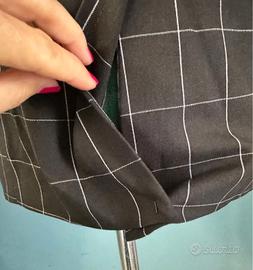 Nuovo, mai indossato, ha ancora gli spacchi laterali cuciti. Nero con riga grigia, tg 48-M