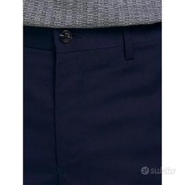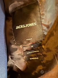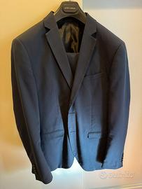 Abito completo blazer monopetto uomo della marca danese Jack & Jones. Giacca + pantaloni. Vestibilità: super slim fit moderna. Composizione: 78% Poliestere, 17% Viscosa, 5% Elastan Colore: Blu scuro Taglia: 48 Presenta alcuni segni di usura visibili da vicino (pallini sul tessuto).