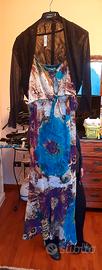 Abito in poliestere fantasia floreale bluette multicolr con coprispalla nero. Taglia 50. Fashion.