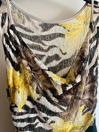 Elegante abito con fantasia animalier e floreale. La parte superiore presenta un design drappeggiato e leggero, mentre la gonna è aderente.