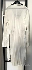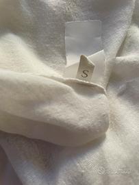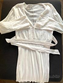 Abito copricostume in garza di cotone, stile impero, maniche lunghe svasate, scollo a V, colore bianco. Bordo maniche e cintura in sangallo. Taglia S (vestibilità ridotta). Dimensioni in cm: spalle 37; lunghezza 94; lunghezza manica 59, Ottime condizioni, nessun difetto.