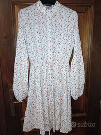 Bellissimo abito a fondo bianco con micro-fiori arancio e azzurri. Il tessuto è fluido e non necessita di stiratura.