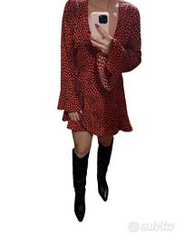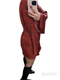 Bellissimo abito corto firmato Boohoo, perfetto per un look romantico e grintoso! Fantasia a cuori rossi su sfondo nero, scollo a V e maniche lunghe con polsini a balza. Modello incrociato con volant sull'orlo, molto femminile e versatile, ideale per una serata speciale o un’uscita casual.