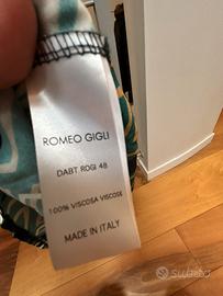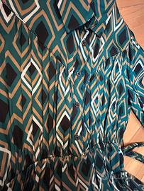 Vendo carinissimo vestitino Romeo Gigli color Petrolio con disegni geometrici color oro, nero e bianco. Elastico in vita e cinturino. Manica lunga con polsino a chiusura bottone. Bellissimo con stivali alti! L‘ho messo una volta sola. E‘ lavato.