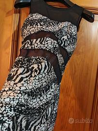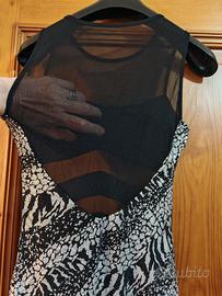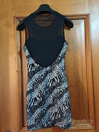 Vendo abito da sera o discoteca in morbida viscosa con inserti in rete trasparente. Lunghezza 80cm.Puo vestire da taglia 40 alla 46,tessuto elasticizzato.