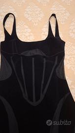 Abito corto Mugler colore nero con motivi in velluto e spalline. Taglia XS. Misure: seno cm 71, circonferenza cm 62, lunghezza cm 83. In ottimo stato