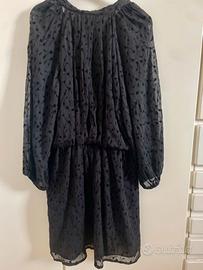 Abito nero, corto, con scollo a V e colletto rotondo.
