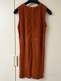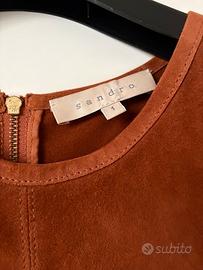Splendido abito smanicato firmato Sandro Paris, un pezzo senza tempo ed estremamente versatile. Realizzato in vera pelle scamosciata (suede) di altissima qualità, morbidissima al tatto. • Colore: Un caldo e ricco color tabacco/ruggine, perfetto per ogni stagione. • Design: Linea dritta ed essenziale con eleganti cuciture a vista che delineano la silhouette. Girocollo rifinito e chiusura posteriore con zip metallica a vista (YKK) che aggiunge un tocco moderno. • Taglia: 1 (corrisponde a una XS/S o 38/40 italiana). • Condizioni: Ottime condizioni, pelle ben conservata e senza segni evidenti di usura.