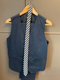 OTTIMA OCCASIONE X UNA CRESIMA DI STILE. Vendo completo x ragazzo firmato Benetton, ORIGINALE composto da pantaloni, giacca e gilet blu, camicia celeste, cravatta e scarpe grigio/blu. taglia abito 162/172 cm (ragazzo di 13 anni). taglia scarpe 41. Condizioni pari al nuovo (il tutto è stato indossato una sola volta e per poche ore. Valore commerciale di circa €300 vendo per €130. Il capo è sfruttabile anche in altre occasioni o nella quotidianità. Preferibile il ritiro in zona. massima serietà.