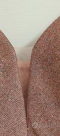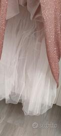 Elegante abito da cerimonia lungo, caratterizzato da un tessuto glitterato color rosa cipria. Modello a trapezio con gonna ampia, scollo a V profondo sorretto da spalline sottili con inserto velato sulla scollaturq, il punto vita è messo in risalto da una sottile cintura di cristalli. Realizzato in lurex scintillante con effetto brillantinato all-over. Taglia 42 ma veste comodo e la chiusura dietro consente di regolare meglio la misura del bustino Usato solo una volta