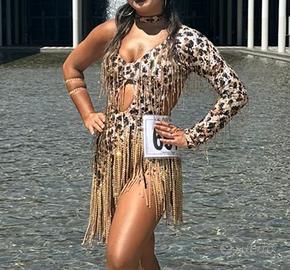 Vendo abito da ballo in ottime condizioni. Prezzo: 300€ trattabili. Abito elastico, veste comodamente dalla taglia S alla M, adattandosi bene al corpo. Molto comodo e pratico, non limita i movimenti. Ideale per competizioni di alta categoria (Classe A e B) grazie alla presenza di numerosi brillantini e strass, che lo rendono molto luminoso in pista. Accessori inclusi: . Collana leopardata . 2 bracciali brillanti ad elastico