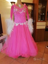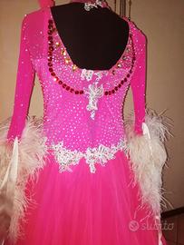 Abito da ballo liscio/sala/standard, colore fucsia, molto visibile in pista, piume ai polsi, corpetto molto strassato, collarino incluso. Misura M/L .
