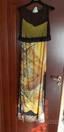 stupendo Abito da Cerimonia Nuovo mai indossato,composto da 2 pezzi abito con fascia elasticizzata al seno e tessuto in raso con i toni caldi del marrone.Presenta spacchi laterali sino al ginocchio e Top nero a rete da mettere sopra .Acquistato 200 euro lo vendo 45 euro.Nuovo con Etichetta.