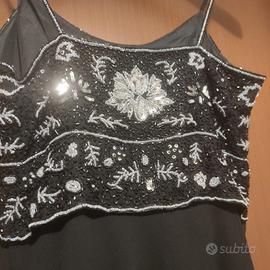 Vendo abito cerimonia nero tg 44 comprato presso Atelier sposa con applicazioni argento e nere ricamate a mano una per una. L'abito presenta la stessa decorazione sia sul davanti che sul retro. Ha balze lunghezza ginocchio ognuna decorate con un filo di perline nero ,uno argento e un altro nero. Bretelline realizzate con un filo di perle . Vendo compreso di stola