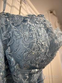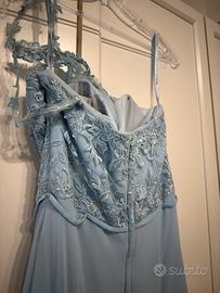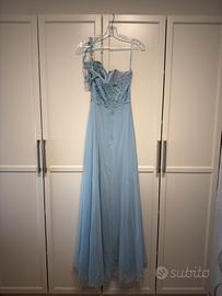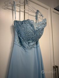 Vendo bellissimo abito lungo color azzurro polvere, ideale per matrimoni, damigelle o eventi eleganti. Il vestito è molto scenografico ma leggero da indossare.