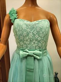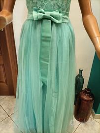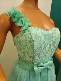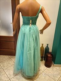Abito donna da cerimonia, con stola, monospalla, disegno a fiori, piccola zip laterale, colore tiffany, 100% Cotone. Taglia S/M. Misure: Seno 35 Cm - Vita (fiocco) 30 Cm - Lunghezza 120 Cm. Video articolo e altri articoli disponibili sul profilo facebook 2EFFEMOD