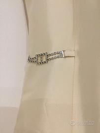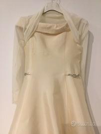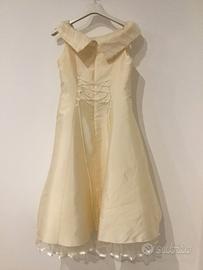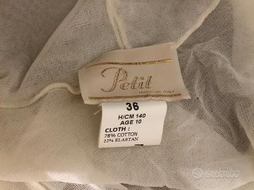 Abito da bambina per prima comunione, o per altre occasioni importanti, in tessuto misto seta. L'elegante vestito color seta, a spallina larga è impreziosito da elementi in zirconi ed è anche arricchito da un sottogonna in tulle. L'abito è venduto insieme al coprispalla della PETIT, dello stesso colore. Ottima vestibilità.