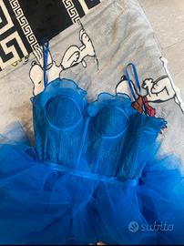 Abito da cerimonia lungo blu in pizzo,con motivo a corsetto e spacco laterale,taglia S