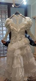 Abito sartoriale dal taglio classico.... importanti ricami di perline... manica lunga.. bustino sagomato per evidenziare il punto vita.... sottogonna incorporata....ampia scollatura sulla schiena con 19 bottoncini... custodia per riporlo...lavato... tenuto ottimamente..non sgualcito sul fondo...
