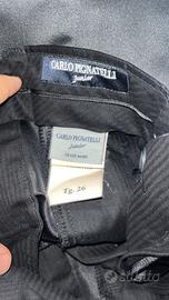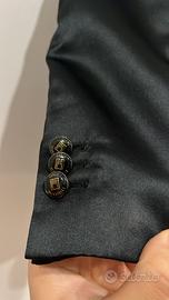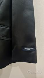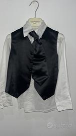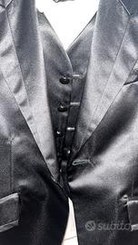 Questo abito da cerimonia per bambino di Carlo Pignatelli Junior è un completo elegante, pensato per un bambino di circa 5 anni, ideale per occasioni formali come matrimoni, battesimi o eventi speciali. 1. Giacca: • Colore: Nero lucido effetto satinato. • Modello: Classico a un bottone, con rever a lancia e taschino sul petto (con fazzoletto coordinato). • Tasche: Due tasche frontali con patta. • Dettaglio: Logo “Carlo Pignatelli Junior” sull’etichetta della manica. • Fodera interna: Bianca, in tinta con la camicia. • Vestibilità: Slim elegante, taglio sartoriale per bambino. 2. Camicia: • Colore: Bianco panna. • Colletto classico, leggermente rigido per sorreggere il nodo della cravatta. • Tessuto: in misto poliestere-cotone, resistente ma elegante. 3. Cravatta/plastron: • Colore: Nero satinato, coordinato con l’abito. • Modello: Tipo plastron con nodo fisso e decorazione centrale con fermacravatta scuro lucido. • Pratica da indossare grazie alla struttura preannodata. 4. Pantaloni: • Colore: Nero lucido abbinato alla giacca. • Taglio: Classico con risvolto. • Dettaglio: Tasche laterali e tasca posteriore con bottone. • Chiusura: Con bottone e zip, passanti per cintura. Giacca: • Lunghezza (spalla-orlo): ~40 cm • Larghezza spalle: ~30 cm • Lunghezza maniche: ~36–38 cm • Circonferenza torace: ~64–68 cm Camicia: • Lunghezza: ~42 cm • Spalle: ~29 cm • Maniche: ~36 cm Pantaloni: • Lunghezza totale: ~60–65 cm • Cavallo: ~22–24 cm • Circonferenza vita: ~52–55 cm (regolabile internamente) • Larghezza fondo gamba: ~13