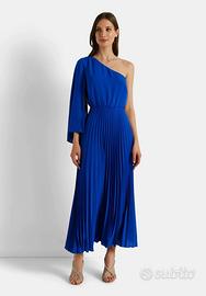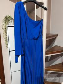 Abiti da cerimonia monospalla con manica aperta sul lato interno, gonna plissettata, elastico in vita, colore blu royal, tg XS. Marca Rinascimento. Sono alta 1,55 a mi arriva alla caviglia, alla modella invece a metà polpaccio. Indossato solo una volta. Comprato a €110 vendo a €50