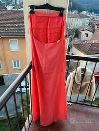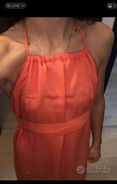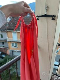 Abito da cerimonia color corallo creato in sartoria, prezzo acquisto 200€, messo solamente una volta, arricciatura sul collo, scollo sulla schiena e due spacchi finali laterali, cintura rimovibile. ha una piccolissima macchia centrale come da foto, ma arricciato non si vede. Lavato in lavanderia. Prezzo trattabile