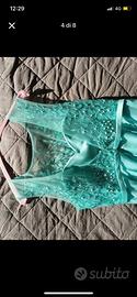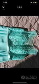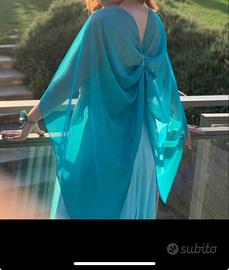 Abito dell'atelier Bortolato, acquistato nel 2020, usato due volte. Colore turchese/verde acqua. Ottime condizioni, taglia 46/48 ma veste fino alla 50. Lunghezza 1.68, io sono alta 1.80, dotato di scialle turchese scuro, con invisibili clip sulle spalle per attaccarlo stile mantellina.