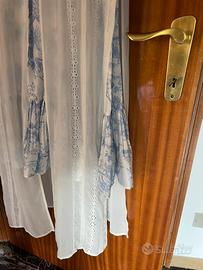 Abito lungo da cerimonia o pomeriggio/sera con bretelle sottili taglio impero e balza in fondo e con fodera. Come completo elegante con uno spolverino o copri spalle più lungo dell’abito. Tutto molto chic elegante ma giovane.