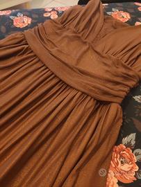 Abito da cerimonia della linea Edas Luxury. Indossato una sola volta, praticamente perfetto. Il colore è un bronzo lurex e il vestito è completamente foderato internamente. La taglia è una 46 italiana, ma veste anche una 44. Il tessuto è molto elastico e si adatta a forme diverse.