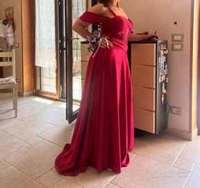 Elegante abito da cerimonia di altissima qualità in un luminoso color magenta, collezione 2025 marchiato PROMULIAS Paris, indossato poche ore e praticamente nuovo. Realizzato in tessuto elasticizzato con fodera interna, presenta un raffinato bustino steccato e un corsetto regolabile sul retro, che garantisce una vestibilità perfetta e un ottimo sostegno.