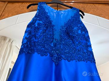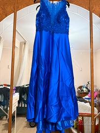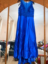 Abito da cerimonia, elegante di sera di colore blu reale. Corpetto caratterizzato in pizzo e una gonna lunga e fluida. Tessuto liscio e lucente.