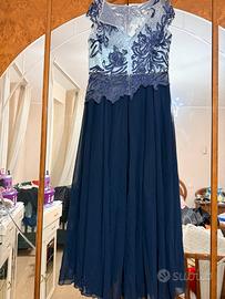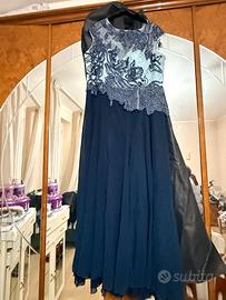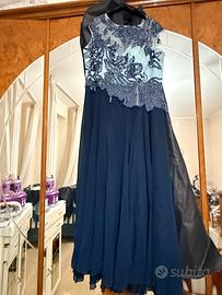 Abito da cerimonia o da sera caratterizzato da un raffinato contrasto tra il corpetto e la gonna. Il. Corpetto ha una base chiara, impreziosita da ricami floreali in pizzo e dí perline di tonalità in blu scuro. Ha uno scollo a V. Gonna realizzata in chiffon blu notte, fluida e leggermente sfasata