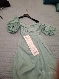 Raffinato abito di chiffon con corpino con scollo a cuore e drappeggio sartoriale asimmetrico che valorizza decolletè e punto vita. Romantiche alette omerali con fitte rouches che ricordano boccioli di