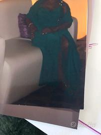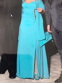 Abito elegante in seta colore verde Tiffany con inserto e bretelline di gioiello tipo smeraldo. Usato 1 sola volta. Taglia 44. Possibilita’ di aggiungere scarpe con tacco 12 numero 36 e borsa tipo pochette con tracolla stesso colore con aggiunta di solo 10 euro.