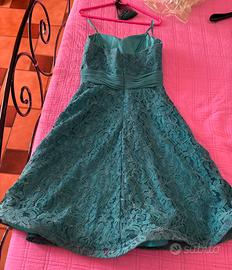Raffinato abito da cerimonia, turchese, in pizzo, taglia S, (vestibilita’ XS ), utilizzato una sola volta, con particolare delle pietre nella fascia centrale.