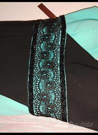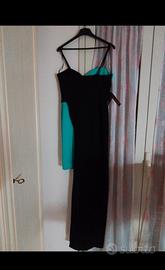 abito da cerimonia con stola nuovo nero e turchese misura 44 con cerniera laterale, fascia sotto il seno ricamata con perline nere luminose, parte superiore a incrocio, parte inferiore turchese sotto il ginocchio, la parte più lunga nera a metà davanti e dietro. Marca Garavaldi più couture.