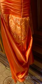 Abito da cerimonia, modello a tubino al ginocchio, in pizzo arancione, con sovragonna in raso arancione. Doppie spalline, stola abbinata in pizzo.