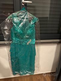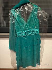 Abito da cerimonia verde smeraldo pizzo e raso , lunghezza gonna sotto il ginocchio , con riporto spilla sulla cintura. Tg 44 . Indossato una sola volta